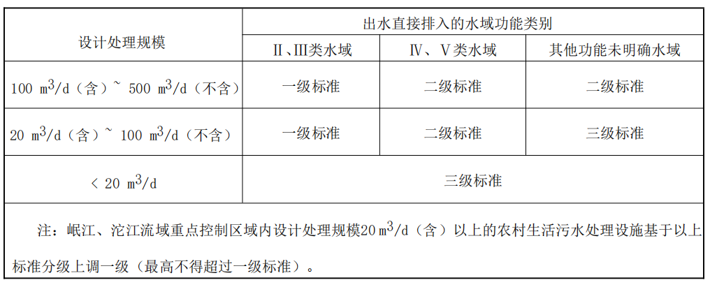 b) 根據(jù)污水處理設施出水直接排入的水域功能類別和設計處理規(guī)模,將農村生活污水處理設施水污染物排放標準劃分為一級標準、二級標準和三級標準,各級標準的適用情況見表 1。其中, 岷江、沱江流域重點控制區(qū)域內(參見附錄A),設計處理規(guī)模 20 m3/d(含)以上的農村生活污水處理設施對應表 1 所列標準上調一級(最高不得超過一級標準);